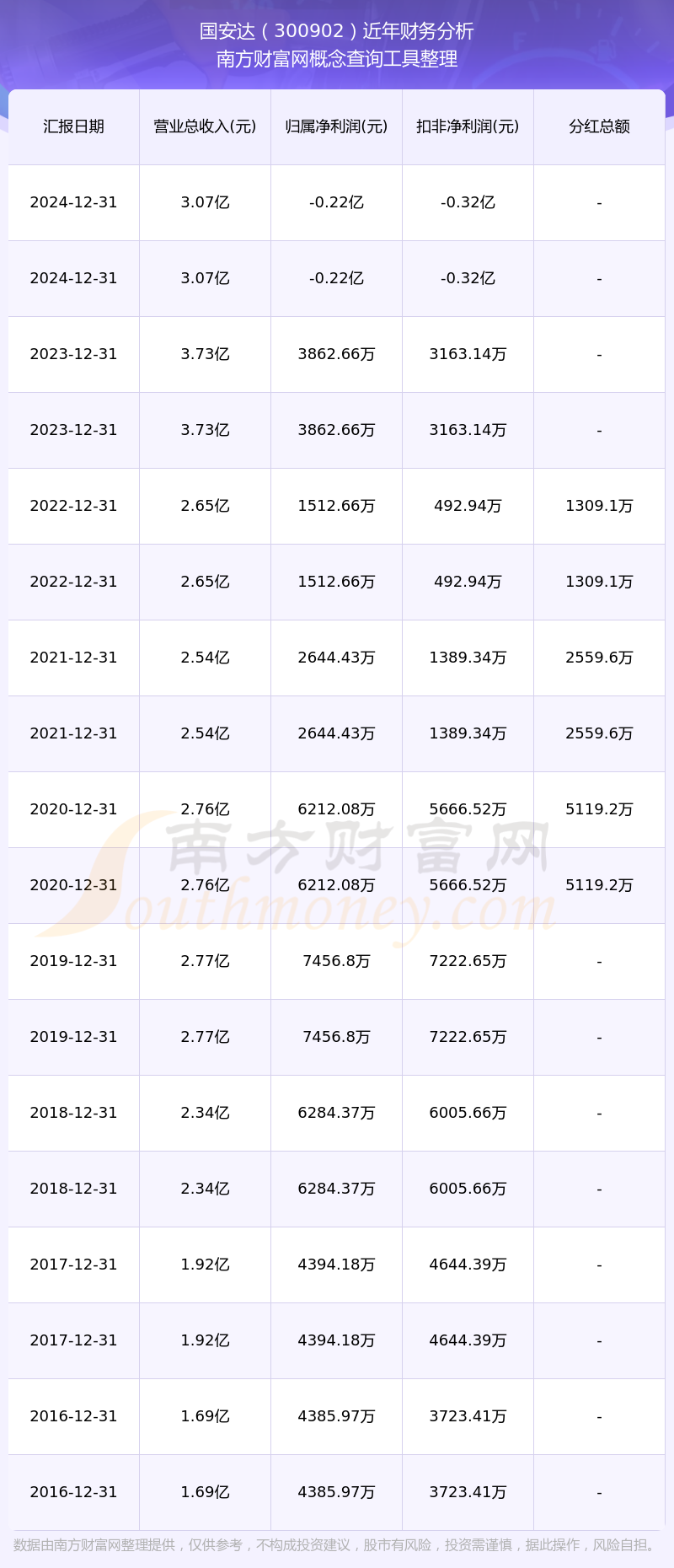 國安達2024年總營收3.07億,同比增長-17.58%;凈利潤-2219.14萬,同比增長-157.45%;銷售毛利率37.84%。