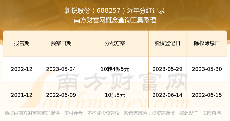 新銳股份最新一次公布的分紅方案為10轉(zhuǎn)4派5元。本次權(quán)益分派股權(quán)登記日為2023年5月29日,除權(quán)除息日為2023年5月30日,派息日為2023年5月30日。