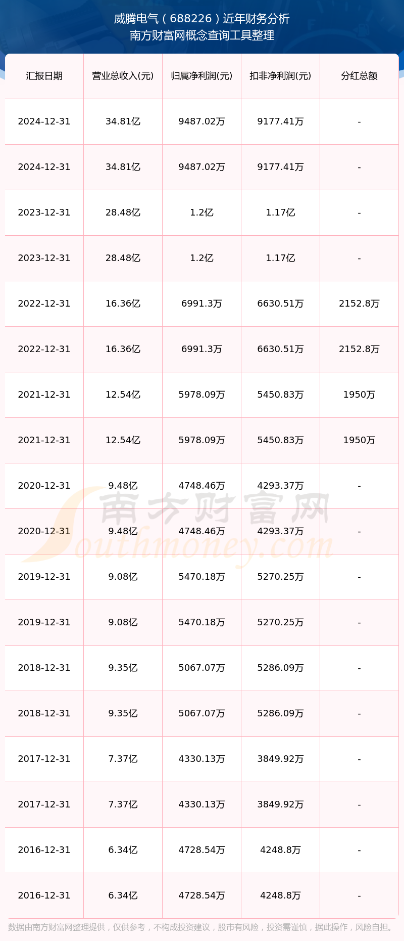 威騰電氣歷年分紅派息情況如下表所示: