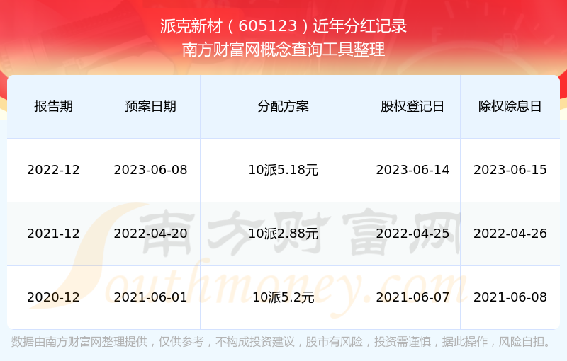 派克新材最新一次公布的分紅方案為10派5.18元。本次權(quán)益分派股權(quán)登記日為2023年6月14日,除權(quán)除息日為2023年6月15日,派息日為2023年6月15日。