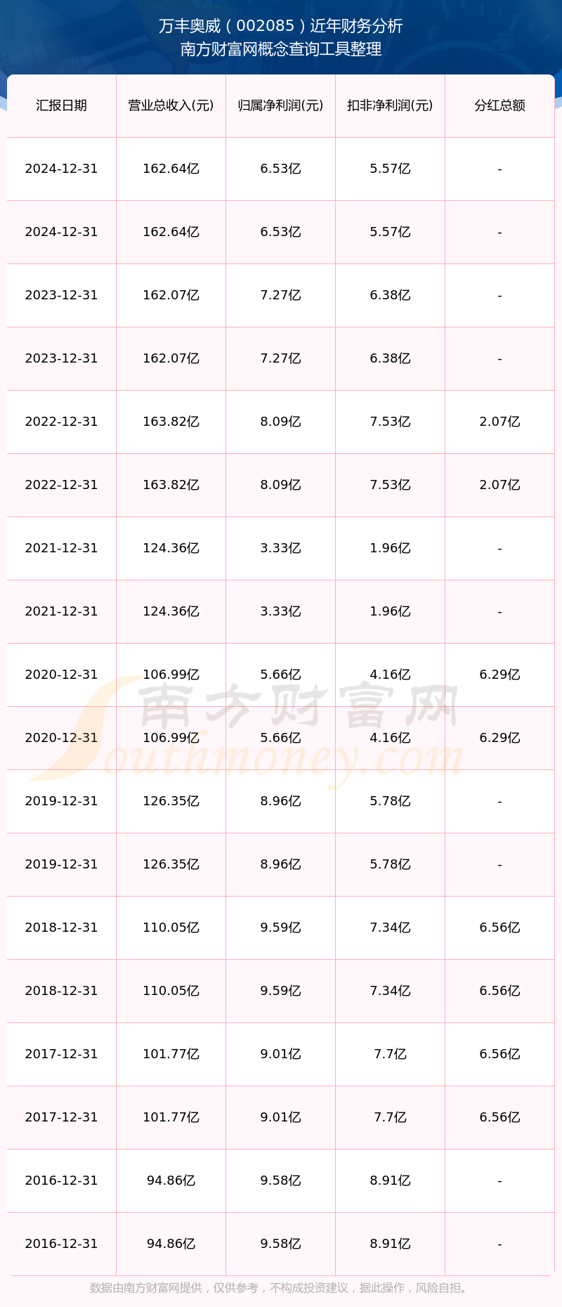 近年萬豐奧威分紅派息情況如下表所示:
