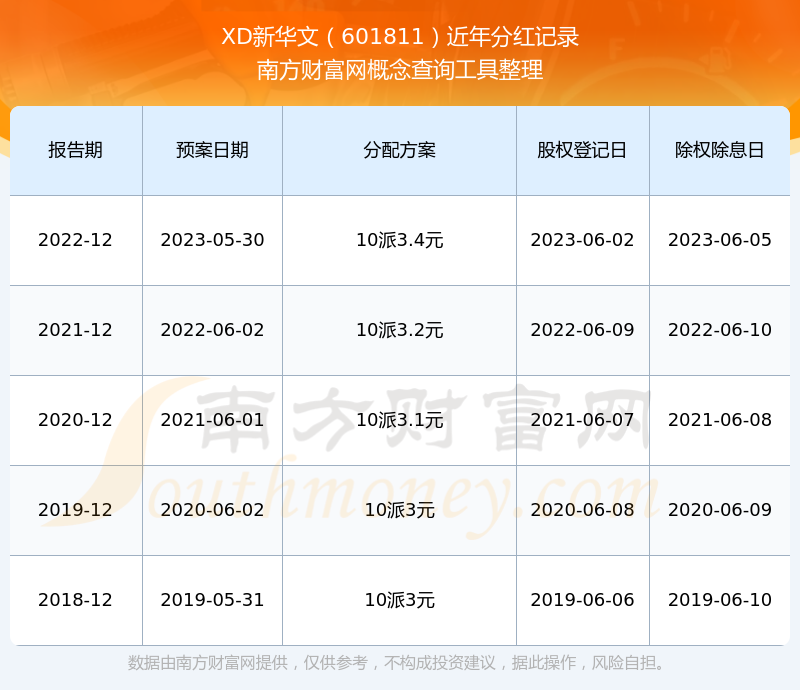 XD新華文最新一次公布的分紅方案為10派3.4元。本次權(quán)益分派股權(quán)登記日為2023年6月2日,除權(quán)除息日為2023年6月5日,派息日為2023年6月5日。