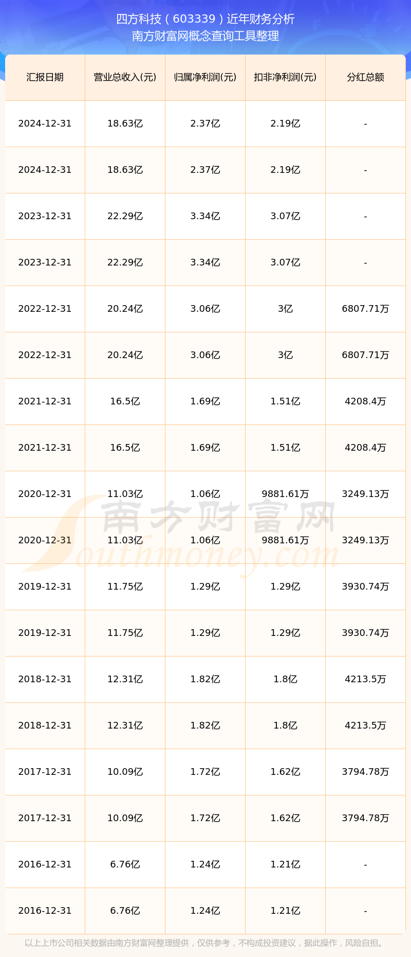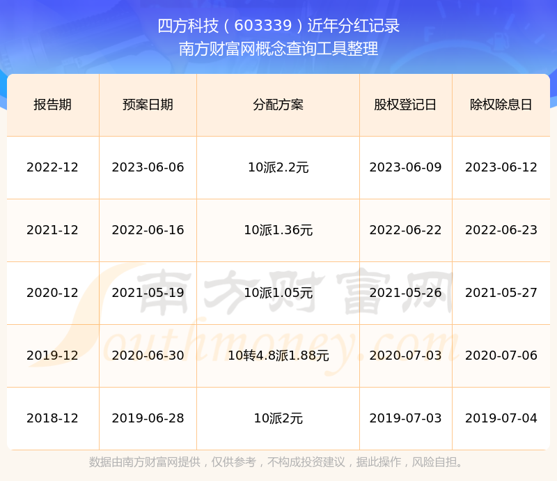 四方科技最新一次公布的分紅方案:10派2.2元。