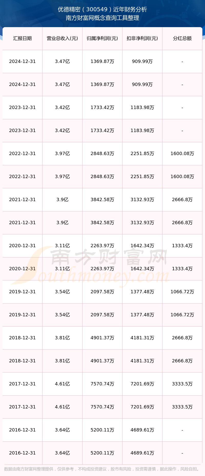 近年優(yōu)德精密分紅派息情況如下表所示: