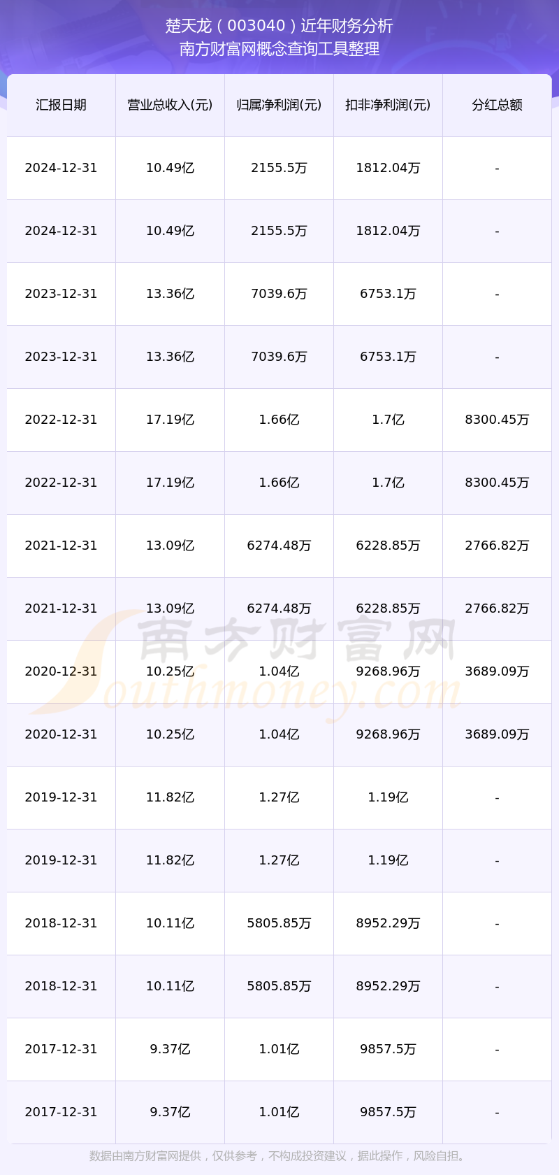 楚天龍2024年總營收10.49億,同比增長-21.52%;凈利潤2155.5萬,同比增長-69.38%;銷售毛利率30.53%。