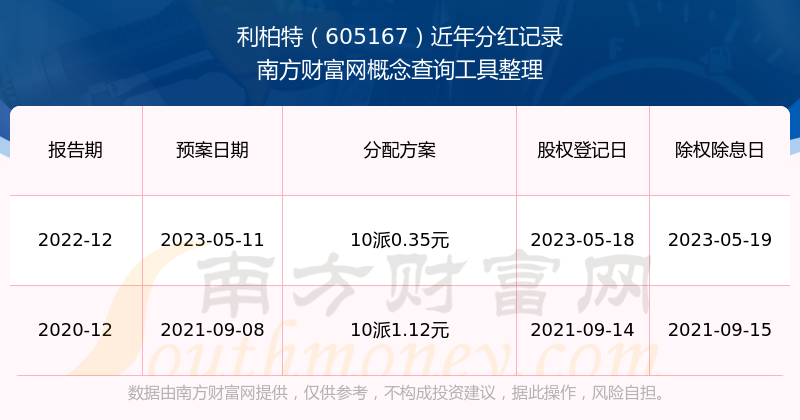 利柏特最新一次公布的分紅方案為10派0.35元。本次權(quán)益分派股權(quán)登記日為2023年5月18日,除權(quán)除息日為2023年5月19日,派息日為2023年5月19日。