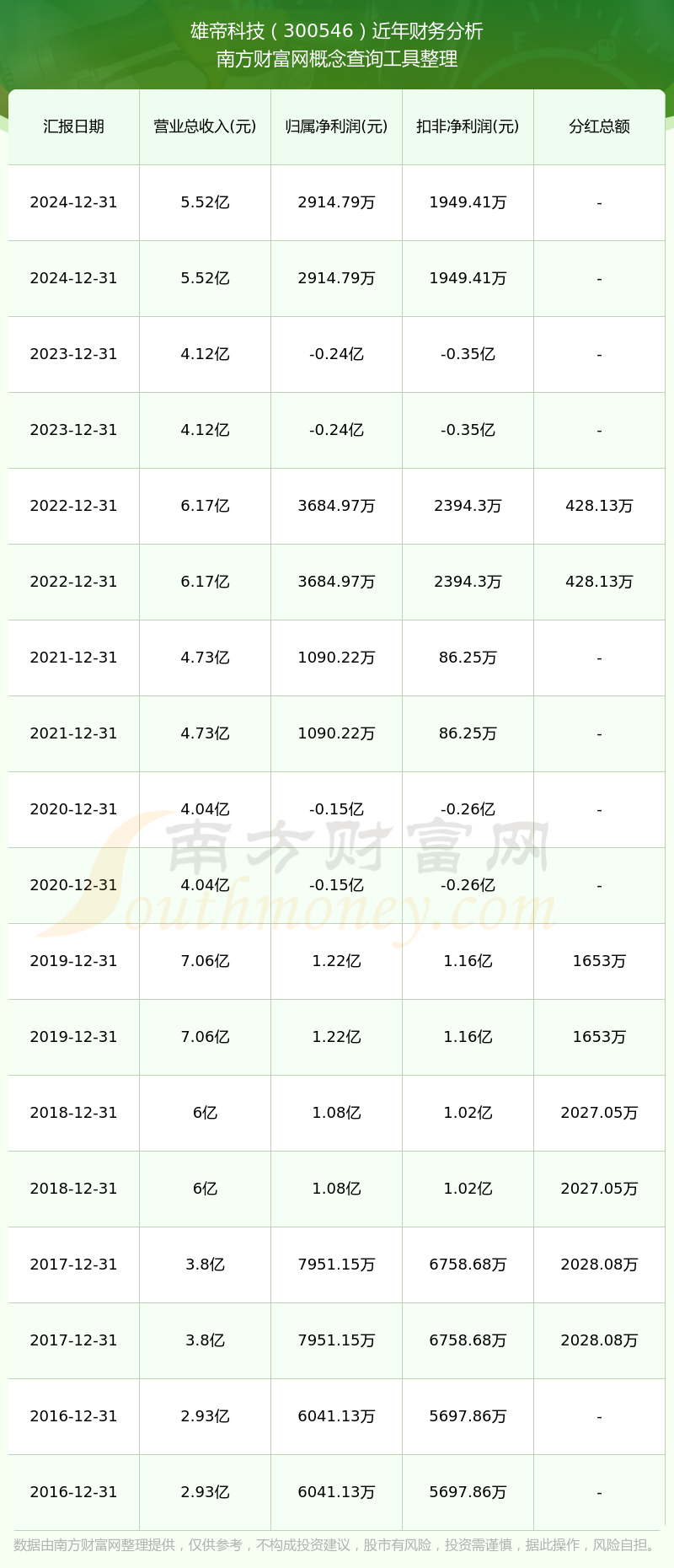 2024年雄帝科技總營收5.52億,同比增長33.93%;凈利潤2914.79萬,同比增長223.78%;銷售毛利率43.65%。