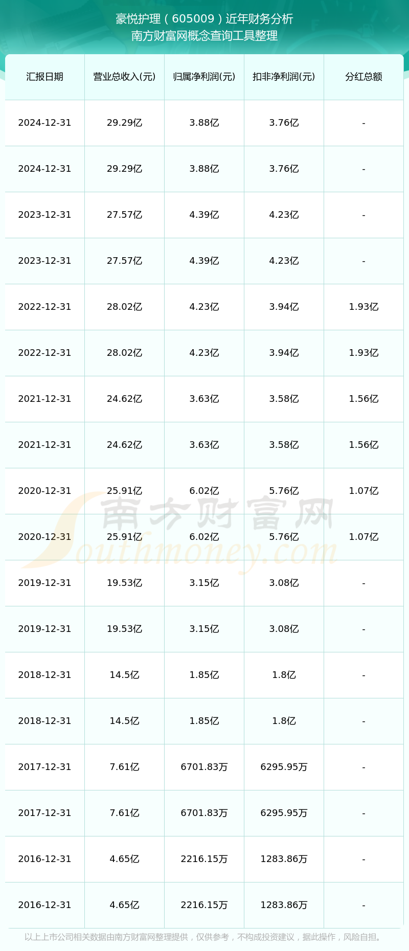 豪悅護(hù)理歷年分紅派息情況如下表所示: