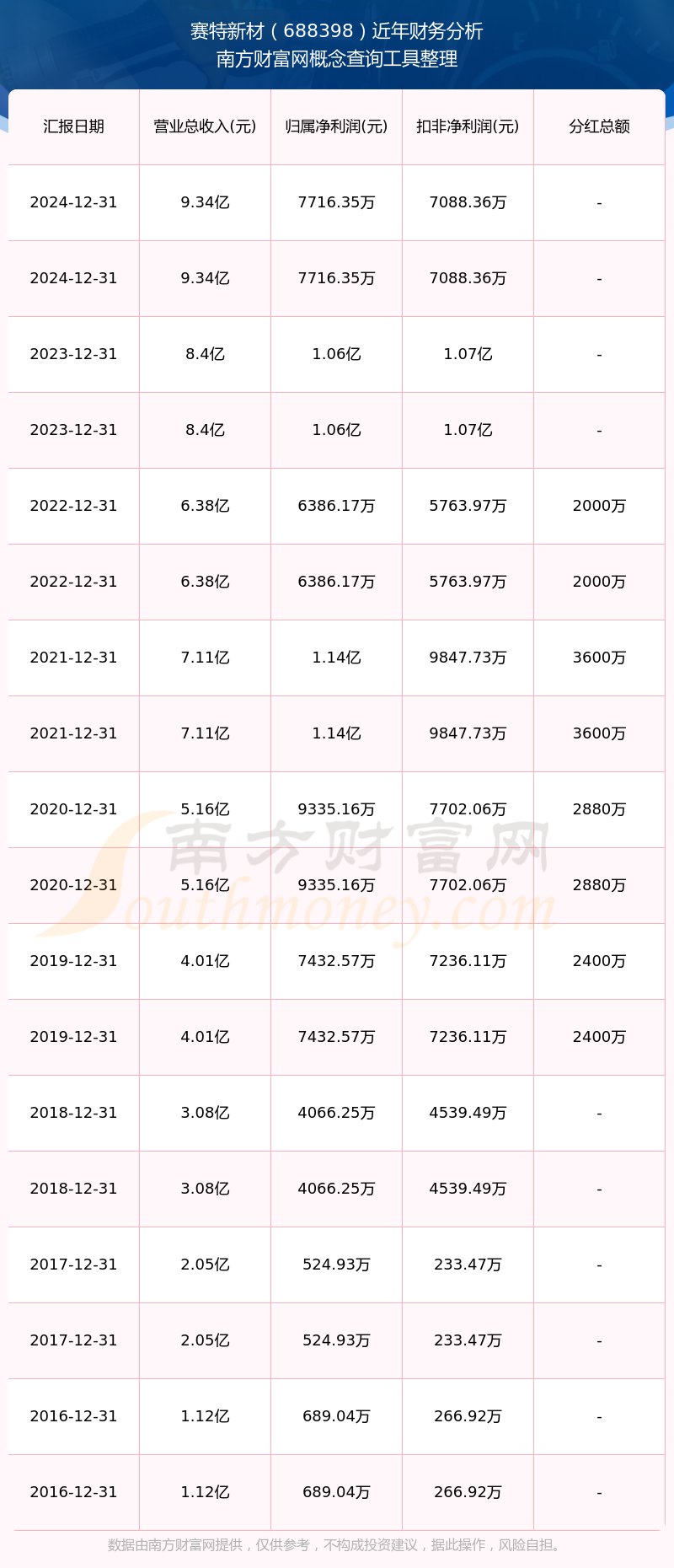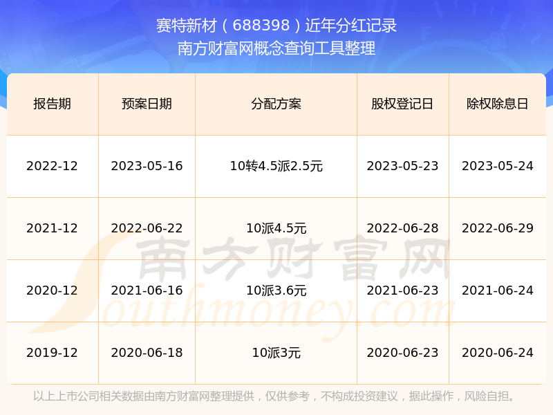 賽特新材最新一次公布的分紅方案為10轉(zhuǎn)4.5派2.5元。本次權(quán)益分派股權(quán)登記日為2023年5月23日,除權(quán)除息日為2023年5月24日,派息日為2023年5月24日。