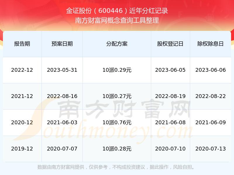 金證股份最新一次公布的分紅方案:10派0.29元。