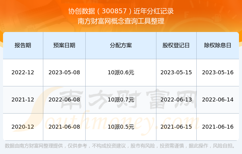 協(xié)創(chuàng)數(shù)據(jù)最新一次公布的分紅方案為10派0.6元。本次權(quán)益分派股權(quán)登記日為2023年5月15日,除權(quán)除息日為2023年5月16日,派息日為2023年5月16日。