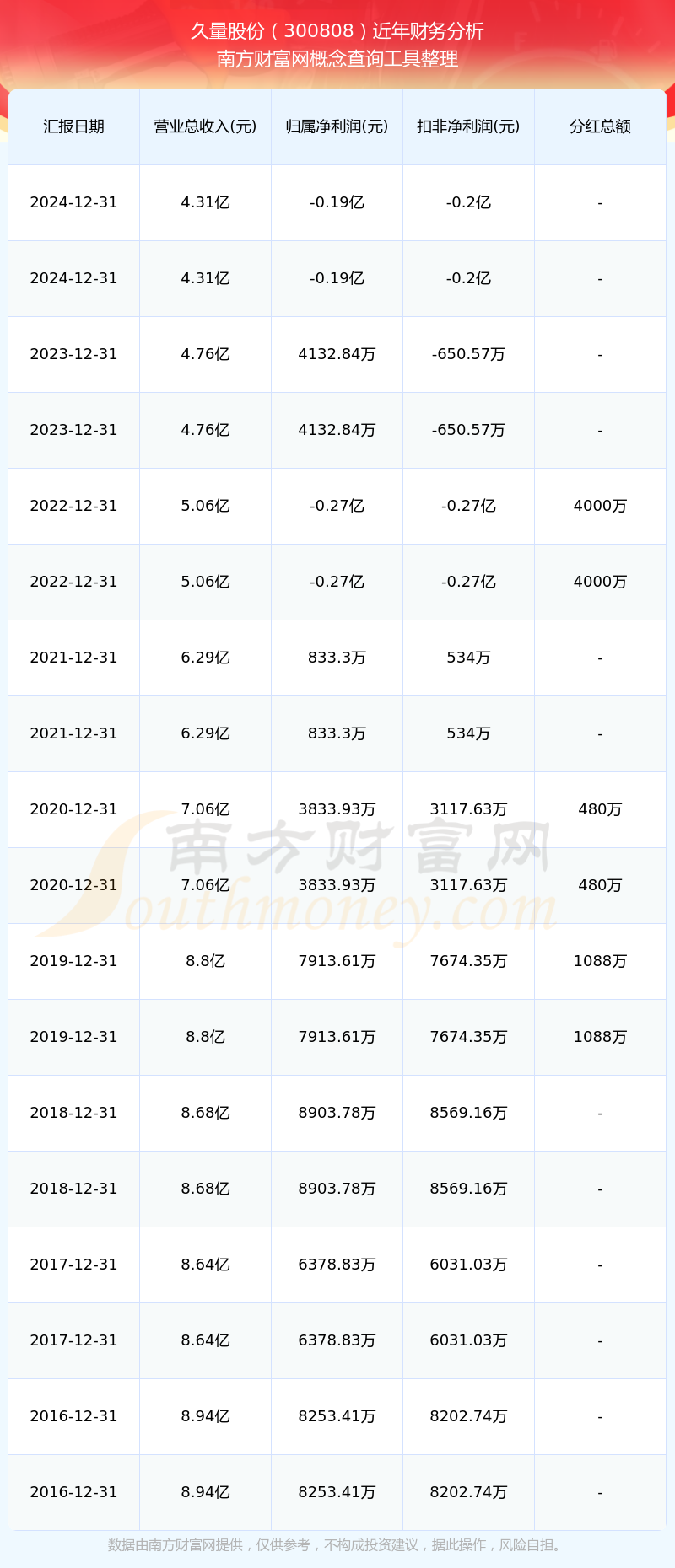 2024年久量股份總營收4.31億,同比增長-9.35%;凈利潤-1937.22萬,同比增長-146.87%;銷售毛利率13.15%。