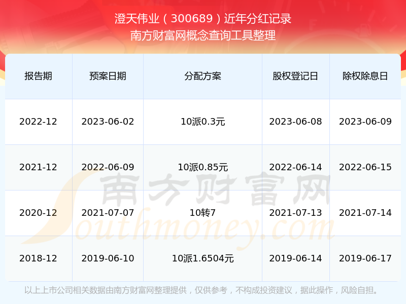 近年澄天偉業(yè)分紅派息情況如下表所示: