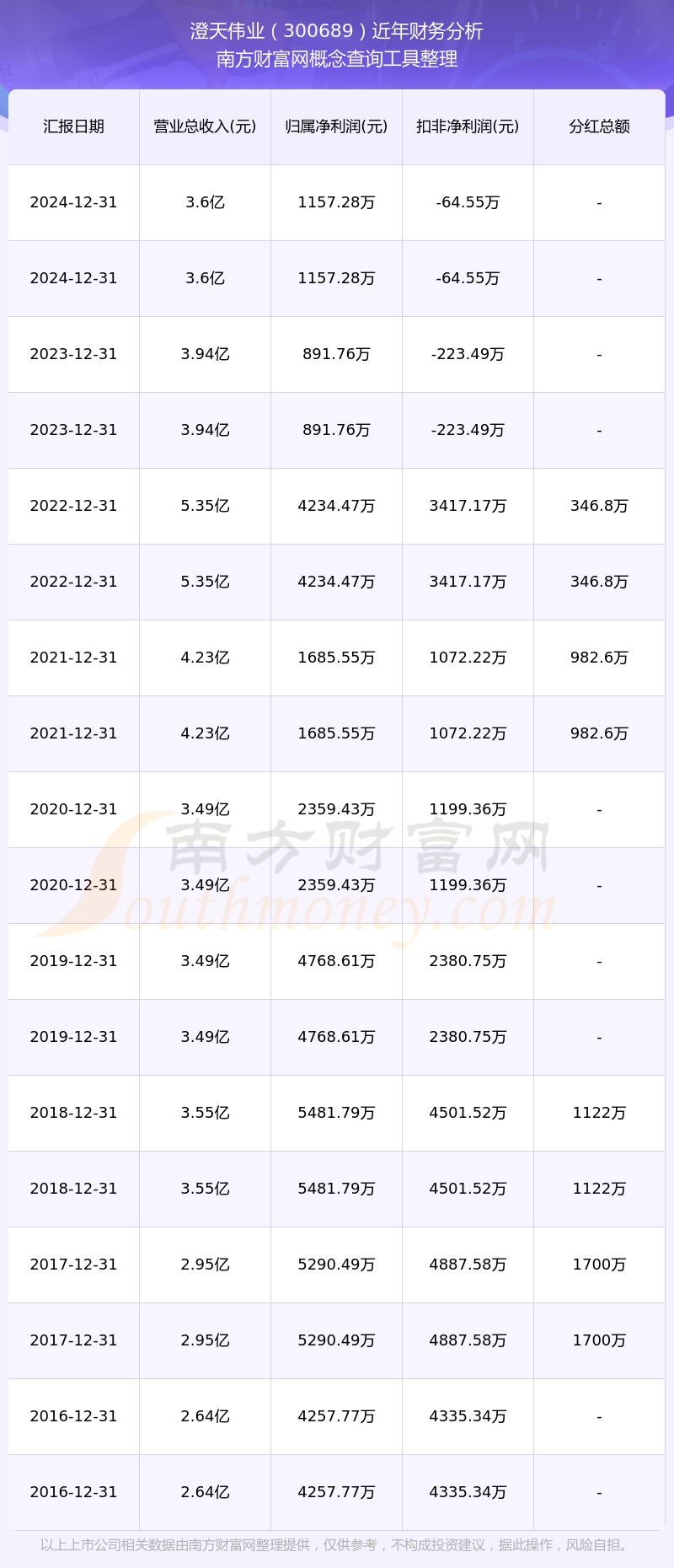 2024年報(bào)顯示,澄天偉業(yè)實(shí)現(xiàn)營收3.6億,同比增長-8.65%;凈利潤1157.28萬,同比增長29.77%;毛利率16.93%。