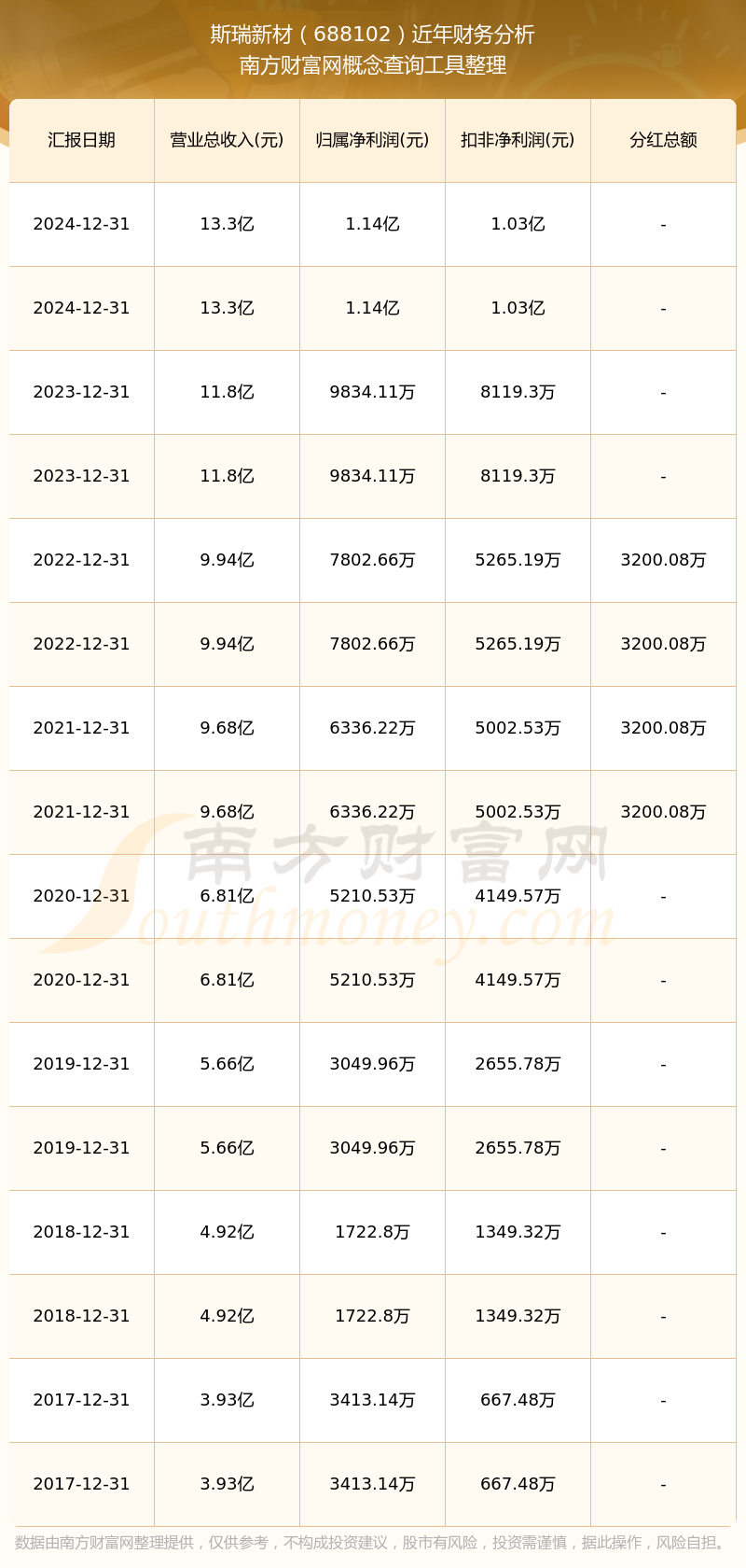 斯瑞新材歷年分紅派息情況如下表所示: