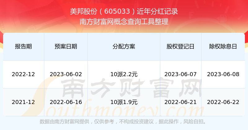 美邦股份最新一次公布的分紅方案為10派2.2元。本次權(quán)益分派股權(quán)登記日為2023年6月7日,除權(quán)除息日為2023年6月8日,派息日為2023年6月8日。