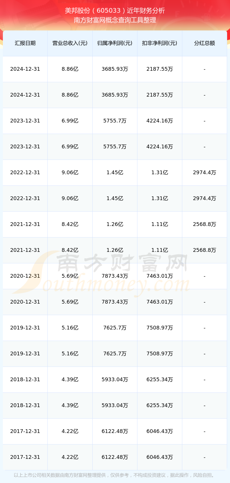 2024年美邦股份總營收8.86億,同比增長26.68%;凈利潤3685.93萬,同比增長-35.96%;銷售毛利率28.55%。