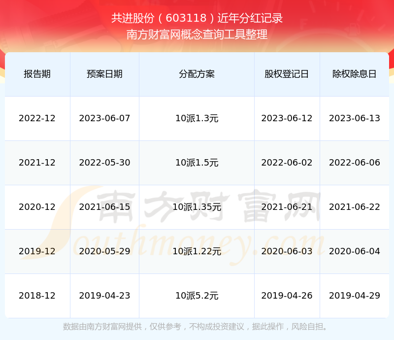 共進(jìn)股份歷年分紅派息情況如下表所示: