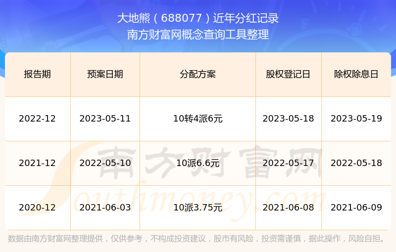 大地熊最新一次公布的分紅方案為10轉(zhuǎn)4派6元。本次權(quán)益分派股權(quán)登記日為2023年5月18日,除權(quán)除息日為2023年5月19日,派息日為2023年5月19日。
