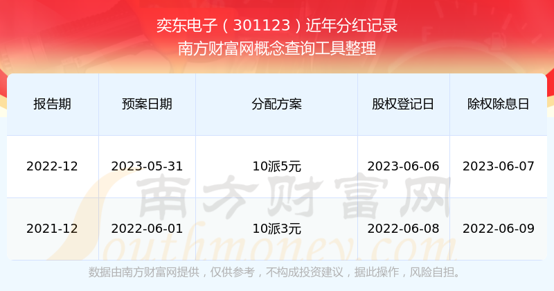 奕東電子最新一次公布的分紅方案為10派5元。本次權(quán)益分派股權(quán)登記日為2023年6月6日,除權(quán)除息日為2023年6月7日,派息日為2023年6月7日。