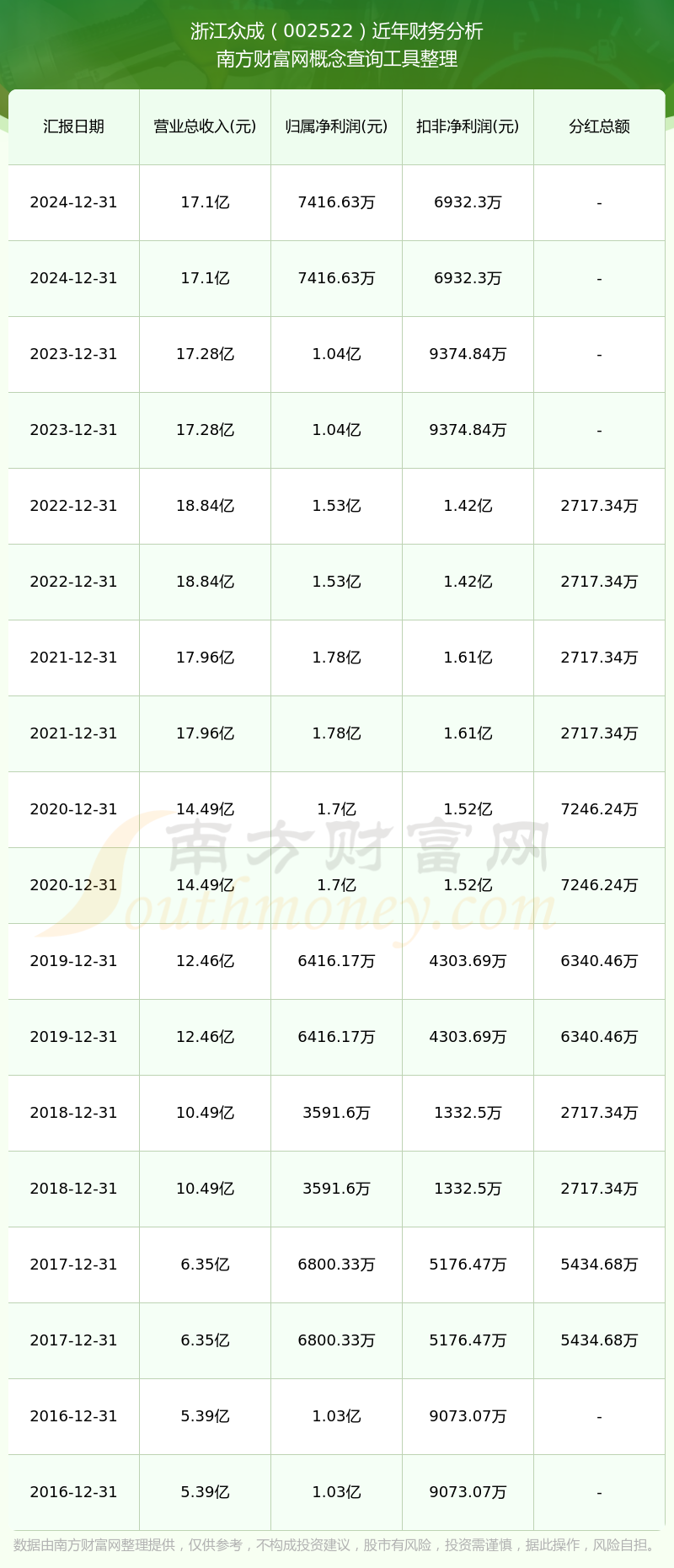 浙江眾成歷年分紅派息情況如下表所示: