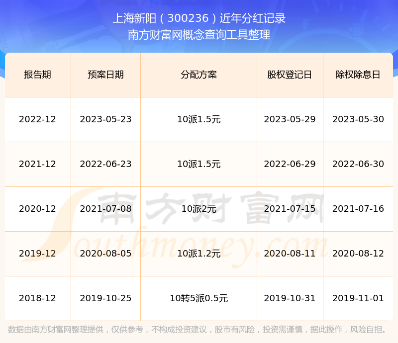 近年上海新陽(yáng)分紅派息情況如下表所示:
