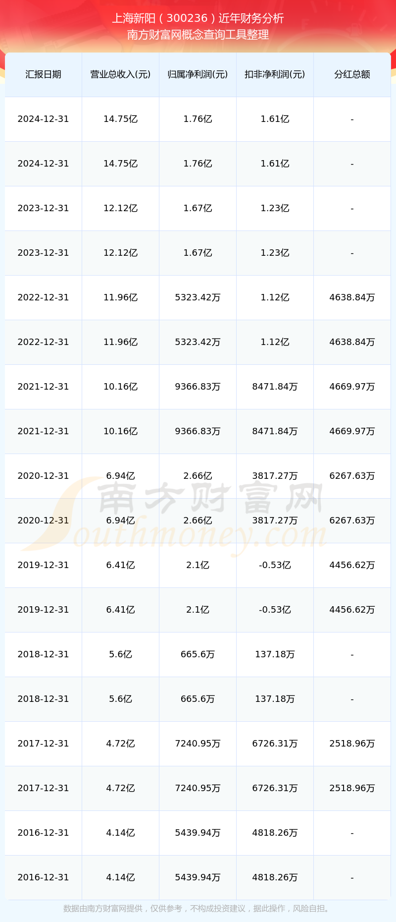 上海新陽(yáng)公司2024年實(shí)現(xiàn)營(yíng)業(yè)收入14.75億元,同比增長(zhǎng)21.67%;凈利潤(rùn)1.76億元,同比增長(zhǎng)5.32%;毛利率39.29%。