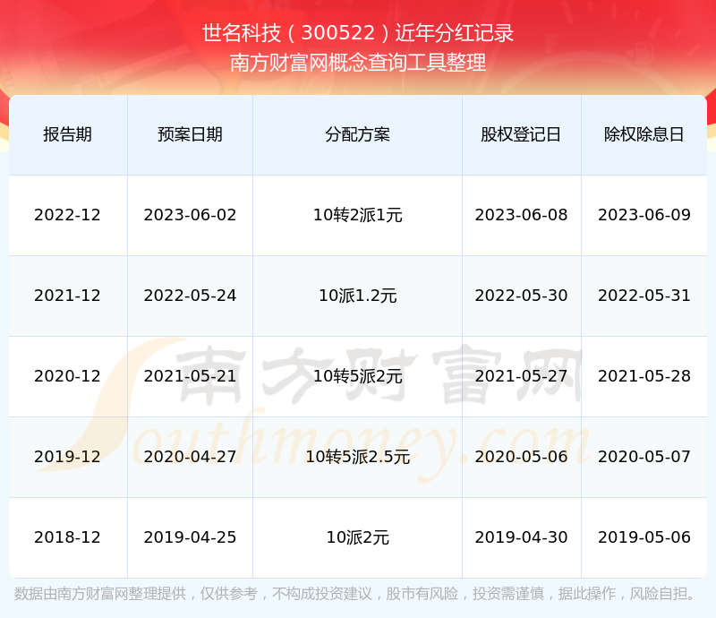 世名科技最新一次公布的分紅方案:10轉(zhuǎn)2派1元。