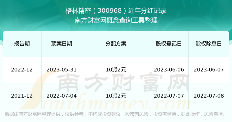 格林精密最新一次公布的分紅方案為10派2元。本次權(quán)益分派股權(quán)登記日為2023年6月6日,除權(quán)除息日為2023年6月7日,派息日為2023年6月7日。