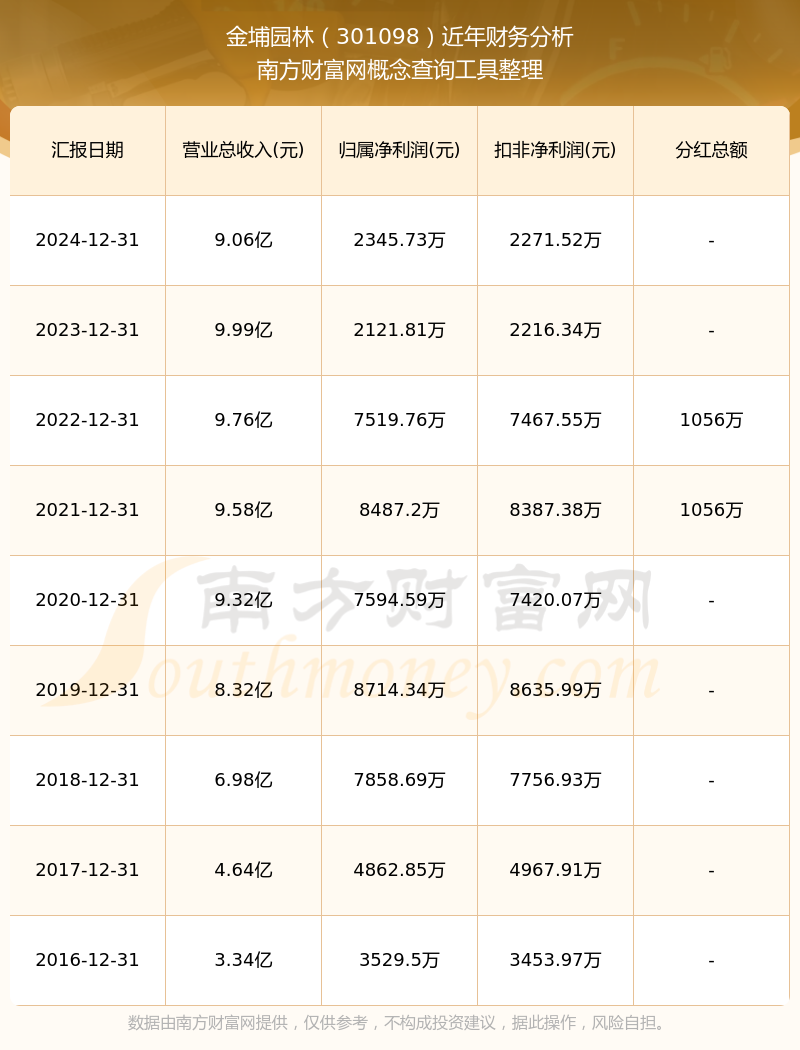 金埔園林2024年總營(yíng)收9.06億,同比增長(zhǎng)-9.32%;凈利潤(rùn)2345.73萬(wàn),同比增長(zhǎng)10.55%;銷售毛利率30.18%。