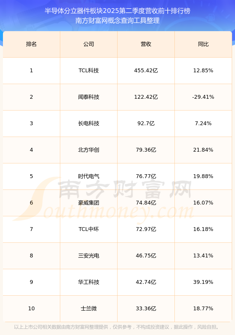 按照南方財(cái)富網(wǎng)概念查詢工具統(tǒng)計(jì),該股所屬板塊為半導(dǎo)體分立器件板塊,該板塊共有67只股票,銀河微電2025第二季度營(yíng)收在該板塊中排名為第54名,該板塊2025第二季度營(yíng)收排名前十的股票如下表: