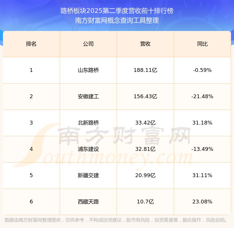 按照南方財富網(wǎng)概念查詢工具統(tǒng)計,該股所屬板塊為路橋板塊,該板塊共有6只股票,山東高速2025第二季度營收在該板塊中排名為第6名,該板塊2025第二季度營收排名前十的股票如下表: