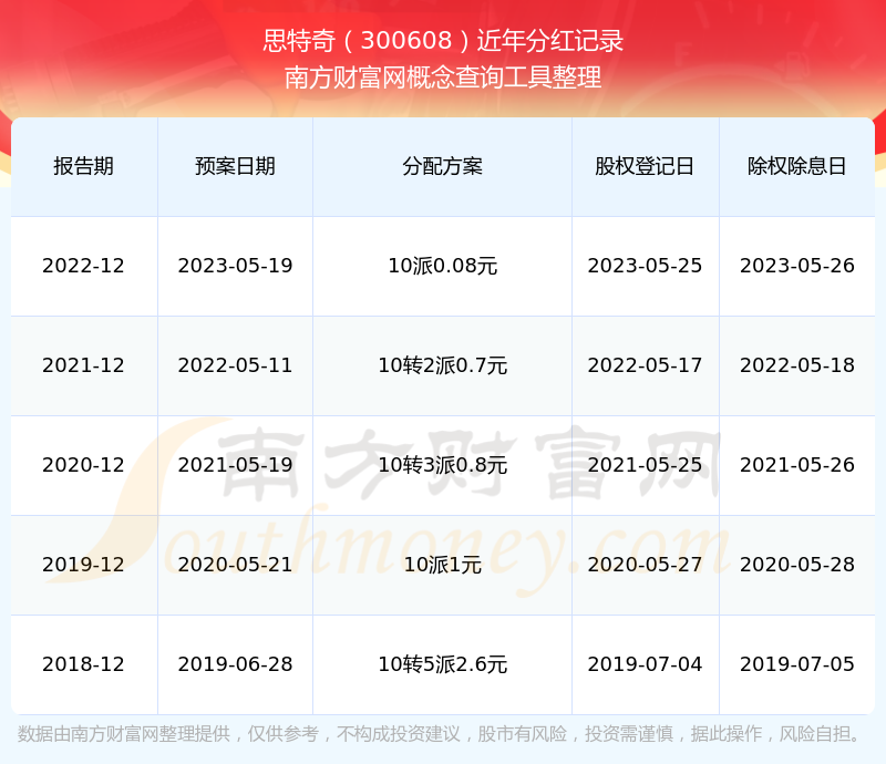 思特奇最新一次公布的分紅方案:10派0.08元。