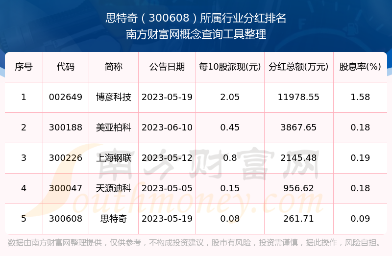 按照南方財富網(wǎng)趨勢選股系統(tǒng)統(tǒng)計,思特奇所屬行業(yè)為軟件開發(fā)行業(yè),軟件開發(fā)行業(yè)分紅排名情況如下表:
