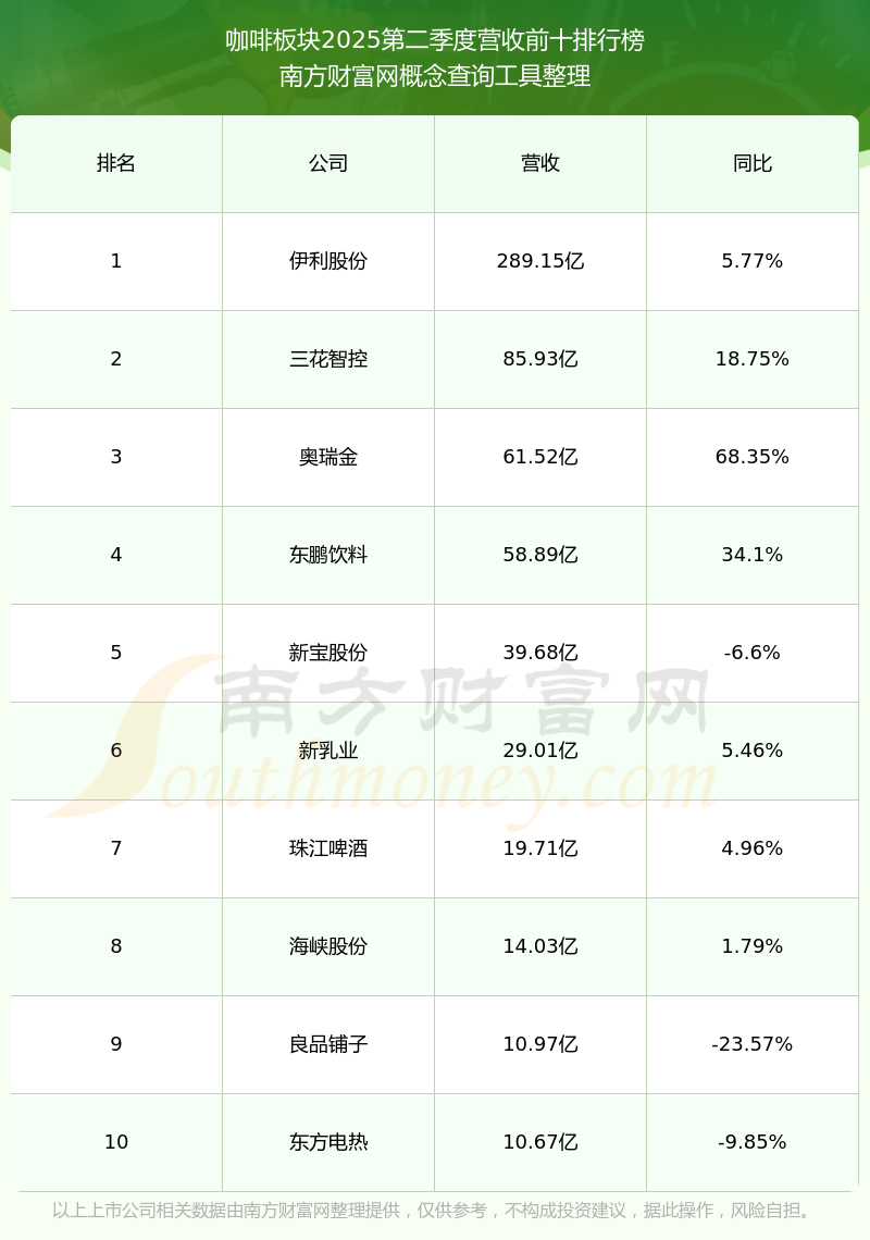 按照南方財富網(wǎng)概念查詢工具統(tǒng)計,該股所屬板塊為咖啡板塊,該板塊共有27只股票,佳禾食品2025第二季度營收在該板塊中排名為第20名,該板塊2025第二季度營收排名前十的股票如下表: