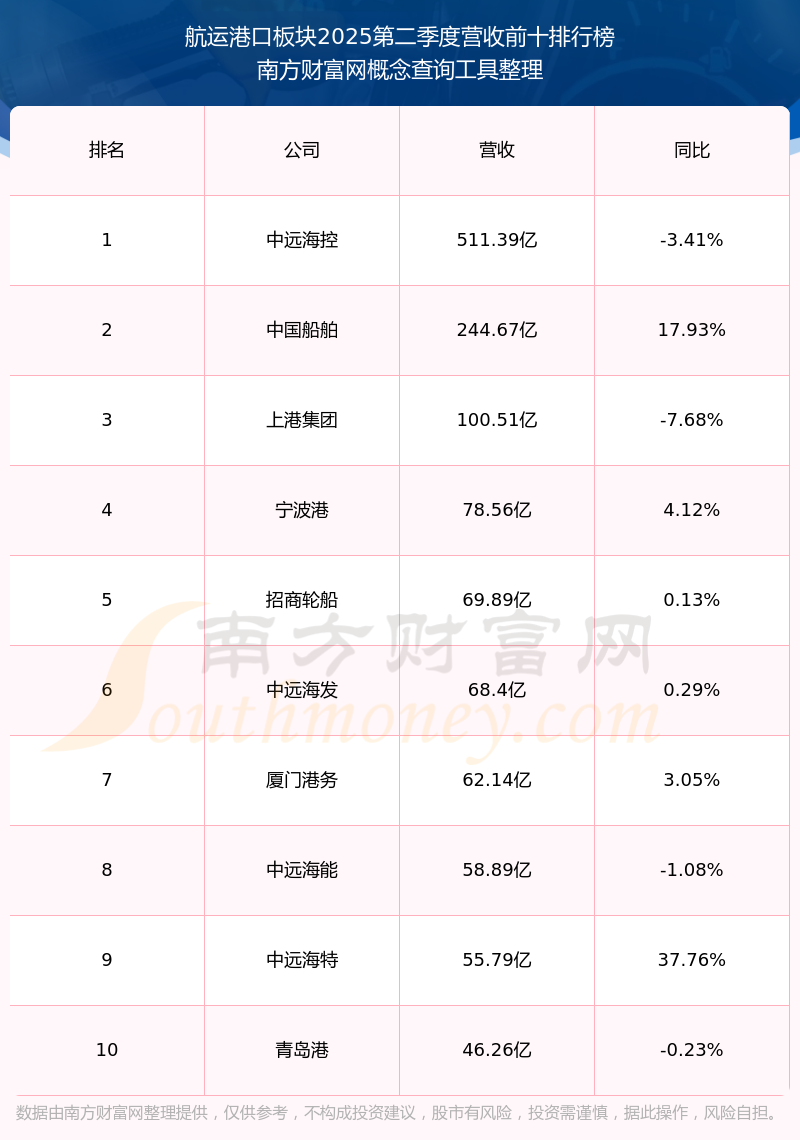 按照南方財富網(wǎng)概念查詢工具統(tǒng)計,該股所屬板塊為航運港口板塊,該板塊共有41只股票,招商南油2025第二季度營收在該板塊中排名為第24名,該板塊2025第二季度營收排名前十的股票如下表: