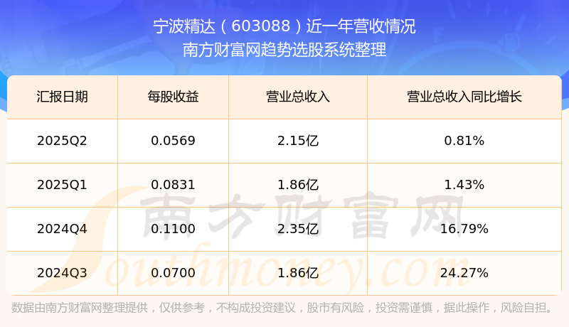 寧波精達(dá)2025年第二季度顯示,公司主營(yíng)收入2.15億元,同比0.81%;歸母凈利潤(rùn)2867.56萬(wàn)元,同比-16.43%;扣非凈利潤(rùn)2824.91萬(wàn)元,同比-10.07%;