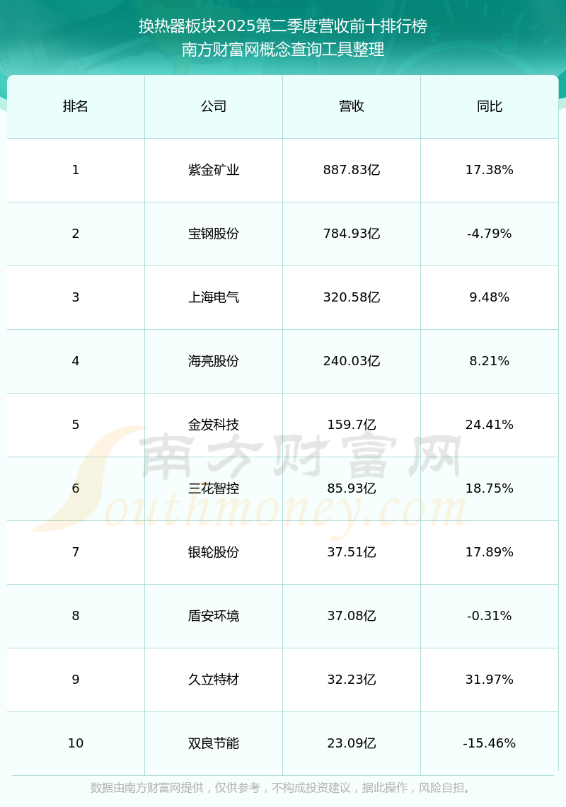 按照南方財(cái)富網(wǎng)概念查詢工具統(tǒng)計(jì),該股所屬板塊為換熱器板塊,該板塊共有29只股票,寧波精達(dá)2025第二季度營(yíng)收在該板塊中排名為第25名,該板塊2025第二季度營(yíng)收排名前十的股票如下表: