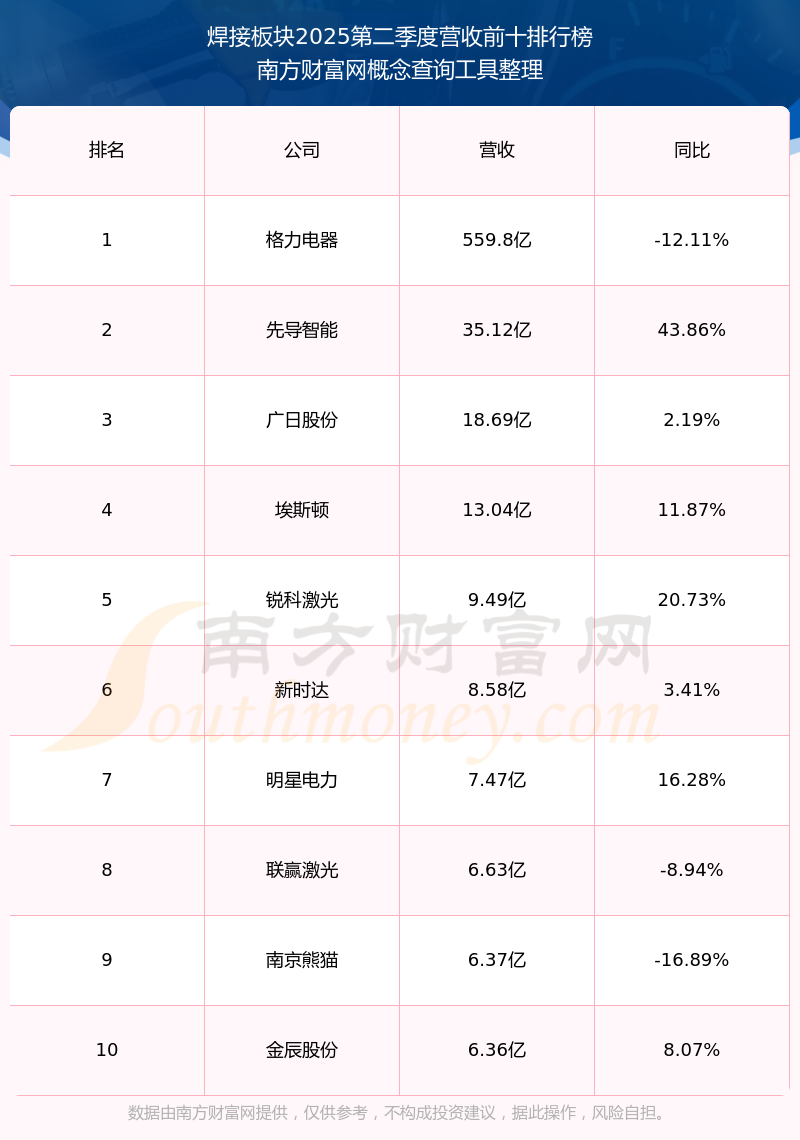 按照南方財富網(wǎng)概念查詢工具統(tǒng)計,該股所屬板塊為焊接板塊,該板塊共有23只股票,聯(lián)贏激光2025第二季度營收在該板塊中排名為第8名,該板塊2025第二季度營收排名前十的股票如下表:
