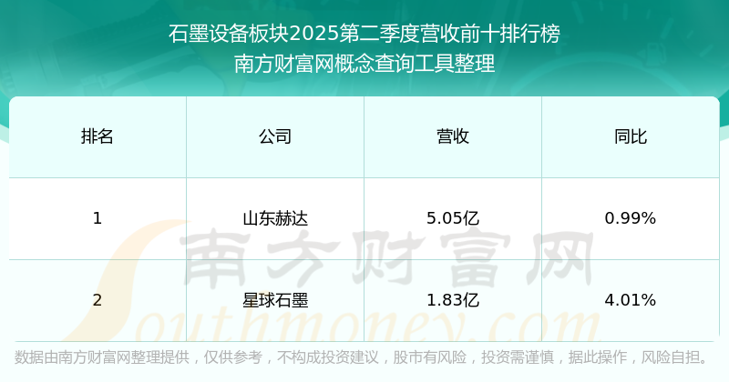 按照南方財富網(wǎng)概念查詢工具統(tǒng)計,該股所屬板塊為石墨設(shè)備板塊,該板塊共有2只股票,星球石墨2025第二季度營收在該板塊中排名為第2名,該板塊2025第二季度營收排名前十的股票如下表: