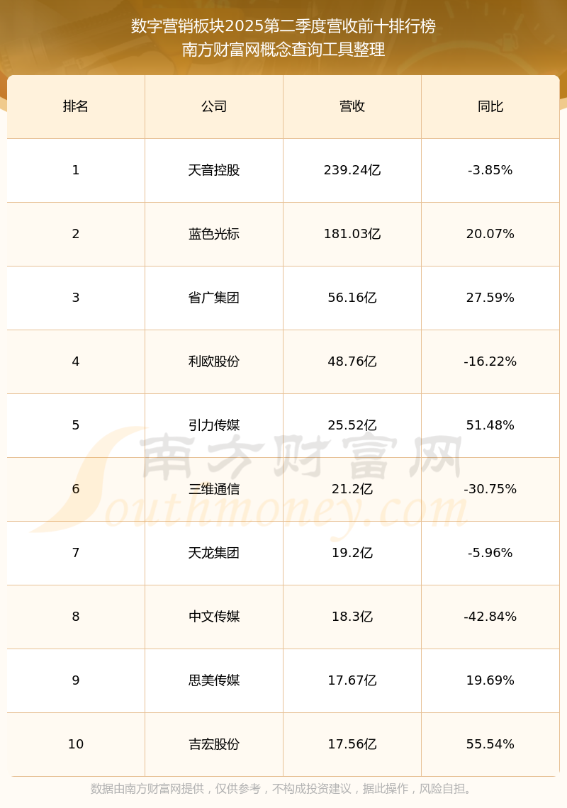 按照南方財富網(wǎng)概念查詢工具統(tǒng)計,該股所屬板塊為數(shù)字營銷板塊,該板塊共有66只股票,三人行2025第二季度營收在該板塊中排名為第19名,該板塊2025第二季度營收排名前十的股票如下表: