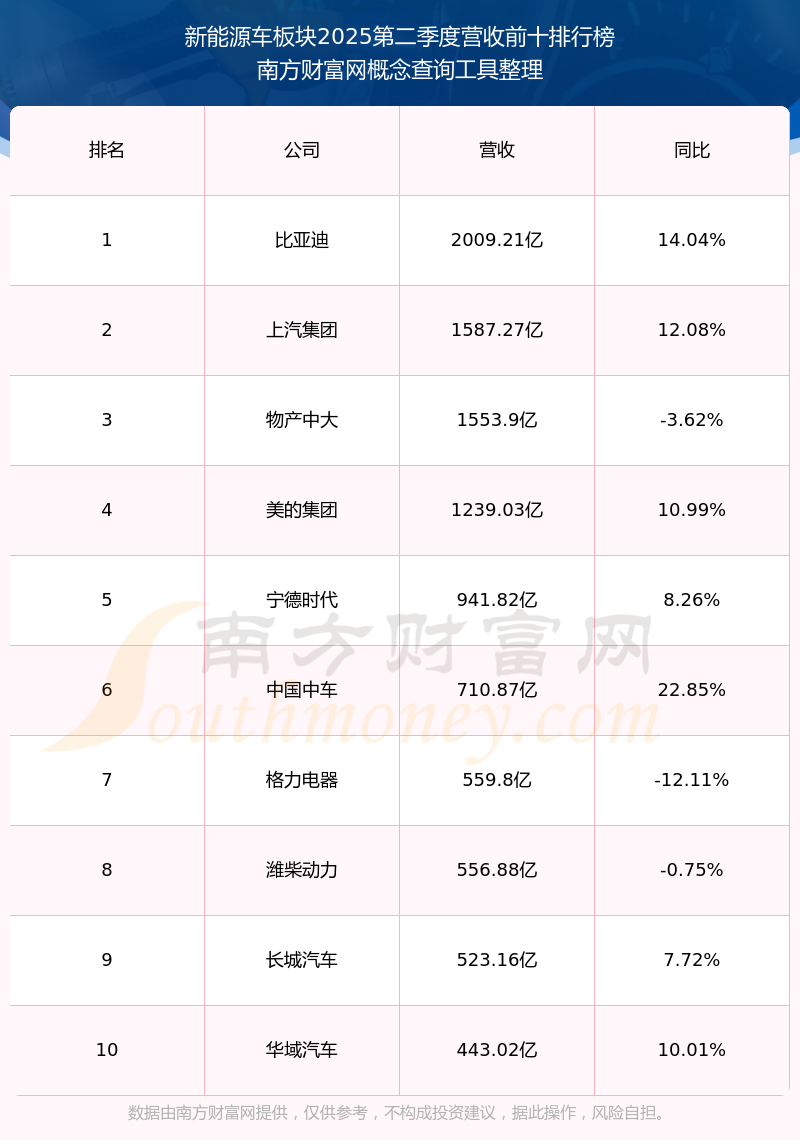 按照南方財(cái)富網(wǎng)概念查詢工具統(tǒng)計(jì),該股所屬板塊為新能源車板塊,該板塊共有653只股票,新坐標(biāo)2025第二季度營(yíng)收在該板塊中排名為第561名,該板塊2025第二季度營(yíng)收排名前十的股票如下表: