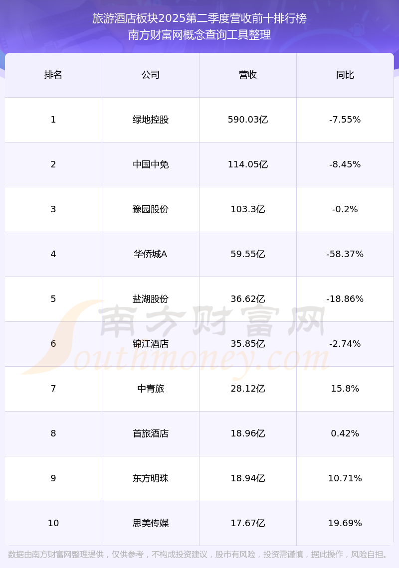 按照南方財富網(wǎng)概念查詢工具統(tǒng)計,該股所屬板塊為旅游酒店板塊,該板塊共有69只股票,大連圣亞2025第二季度營收在該板塊中排名為第60名,該板塊2025第二季度營收排名前十的股票如下表: