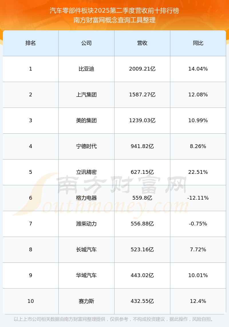 按照南方財(cái)富網(wǎng)概念查詢工具統(tǒng)計(jì),該股所屬板塊為汽車零部件板塊,該板塊共有568只股票,無(wú)錫振華2025第二季度營(yíng)收在該板塊中排名為第267名,該板塊2025第二季度營(yíng)收排名前十的股票如下表: