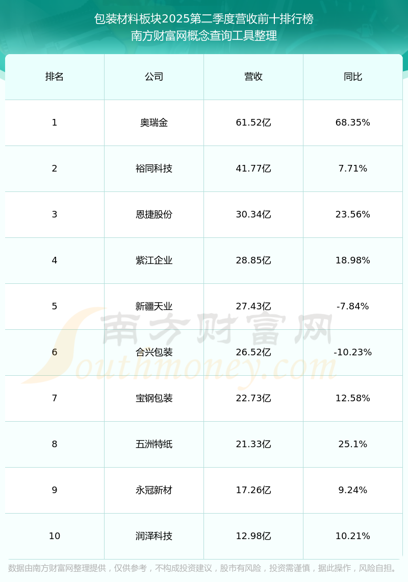 按照南方財(cái)富網(wǎng)概念查詢工具統(tǒng)計(jì),該股所屬板塊為包裝材料板塊,該板塊共有43只股票,新通聯(lián)2025第二季度營(yíng)收在該板塊中排名為第38名,該板塊2025第二季度營(yíng)收排名前十的股票如下表: