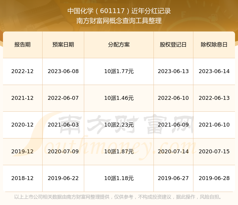 近年中國化學(xué)分紅情況如下表所示: