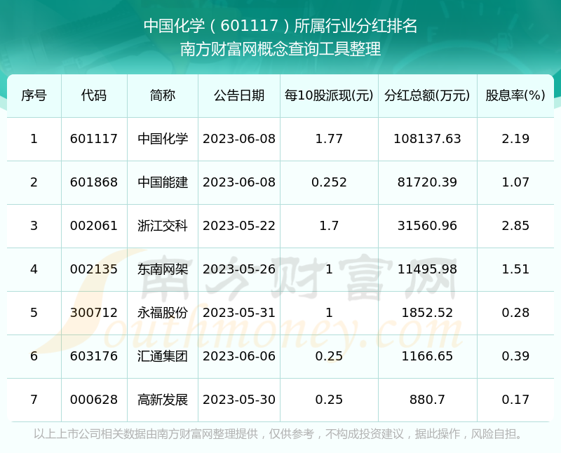 二、中國化學(xué)601117行業(yè)分紅排名