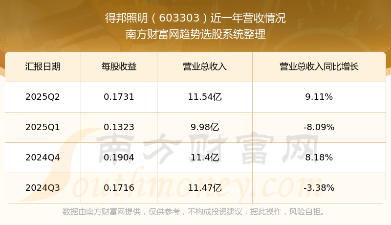 得邦照明2025年第二季度財(cái)報(bào)顯示,公司主營(yíng)收入11.54億元,同比9.11%;歸母凈利潤(rùn)8096.32萬(wàn)元,同比-21.51%;扣非凈利潤(rùn)6327.78萬(wàn)元,同比-34.82%;