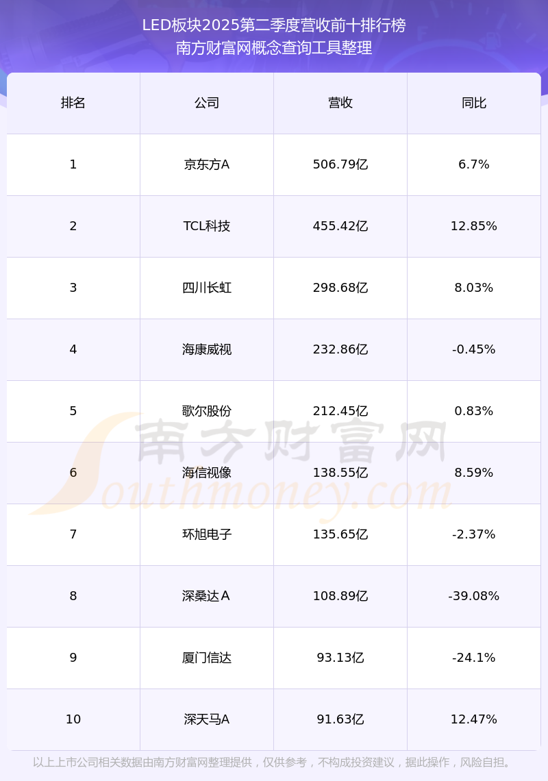 按照南方財(cái)富網(wǎng)概念查詢工具統(tǒng)計(jì),該股所屬板塊為L(zhǎng)ED板塊,該板塊共有168只股票,得邦照明2025第二季度營(yíng)收在該板塊中排名為第53名,該板塊2025第二季度營(yíng)收排名前十的股票如下表: