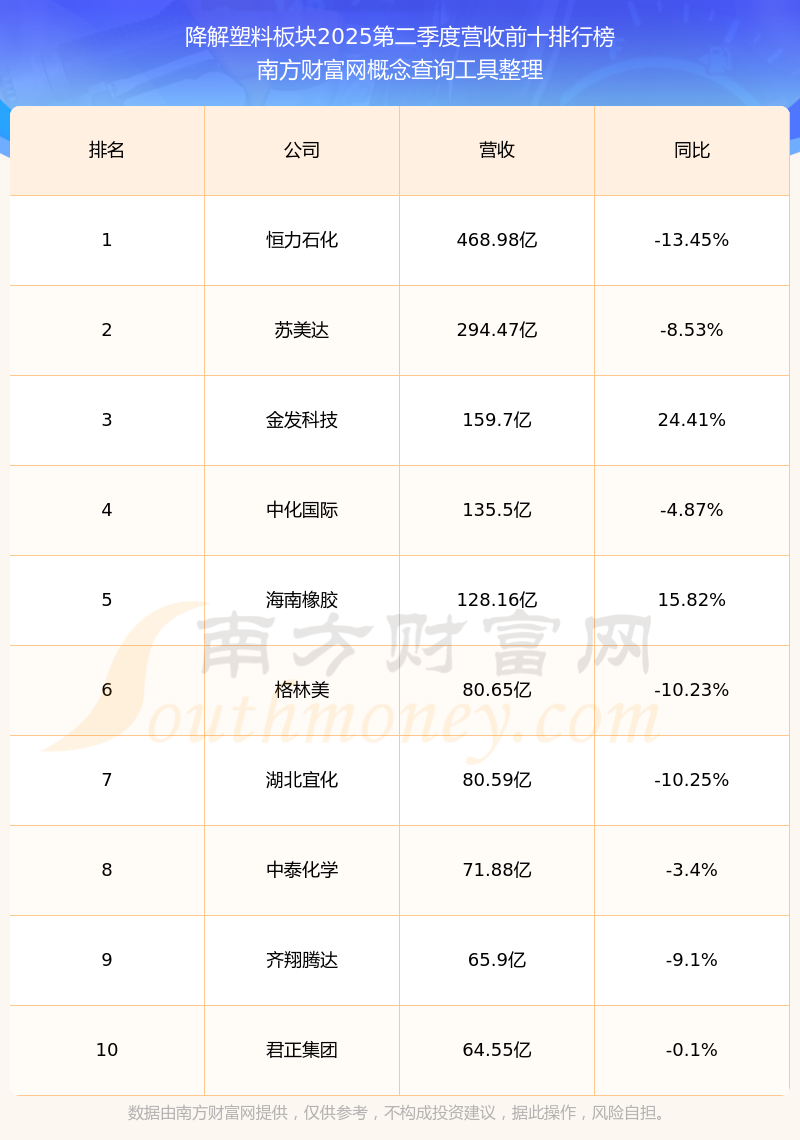 按照南方財(cái)富網(wǎng)概念查詢(xún)工具統(tǒng)計(jì),該股所屬板塊為降解塑料板塊,該板塊共有64只股票,冠豪高新2025第二季度營(yíng)收在該板塊中排名為第22名,該板塊2025第二季度營(yíng)收排名前十的股票如下表: